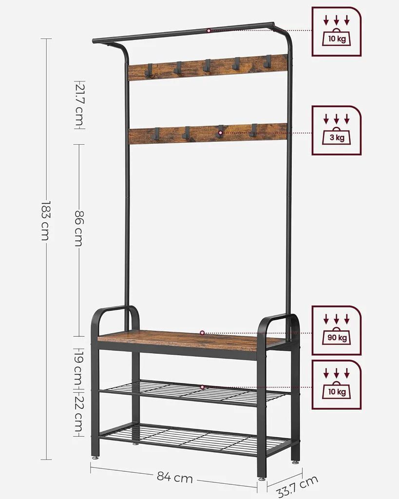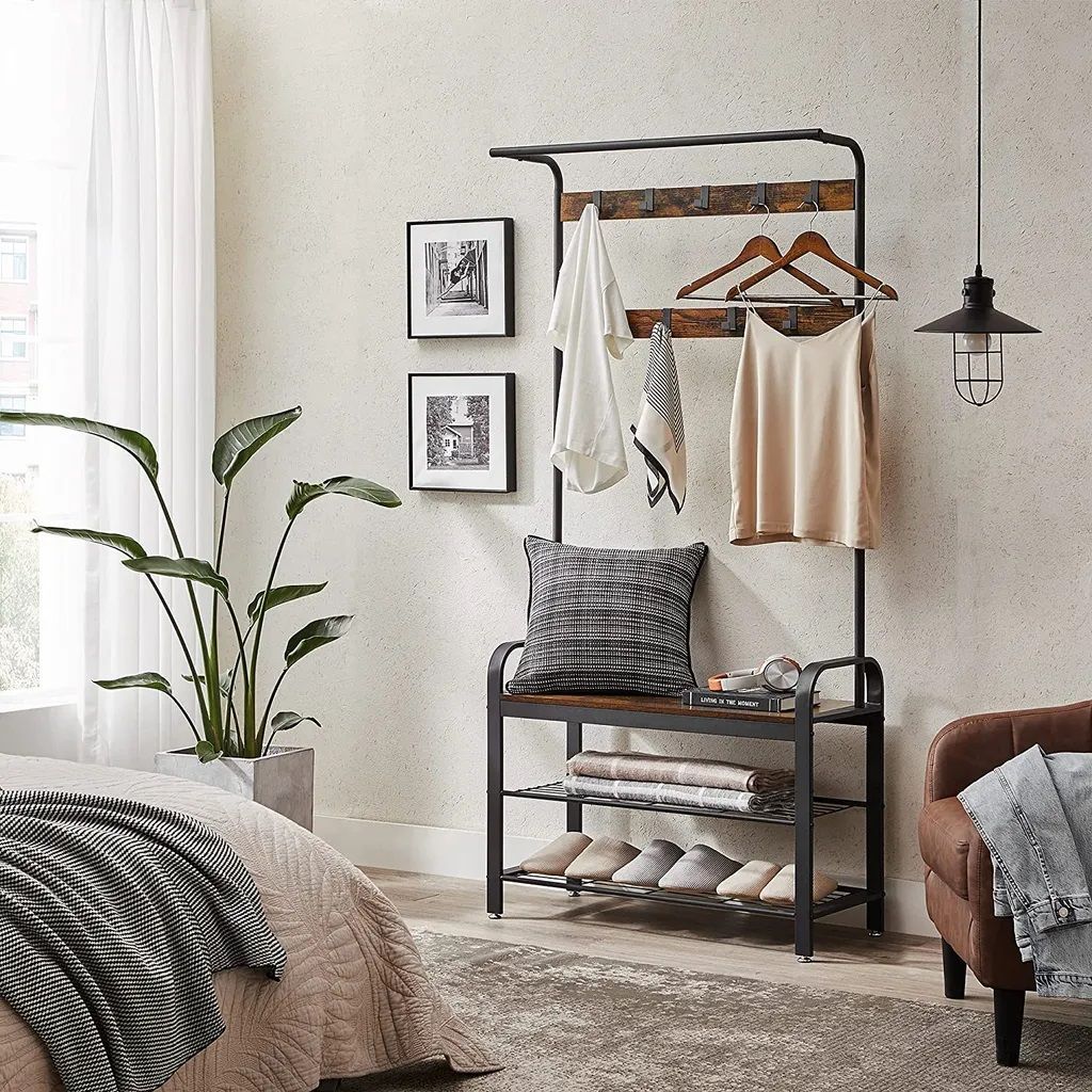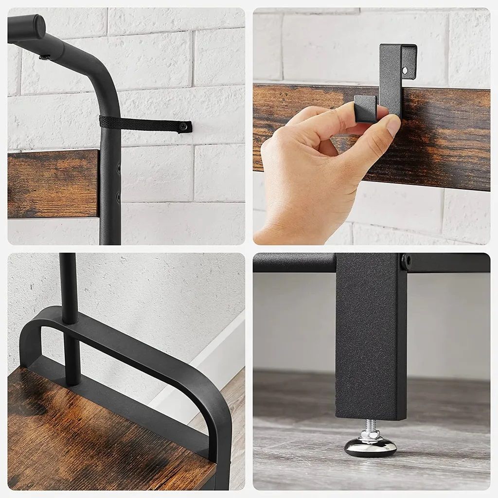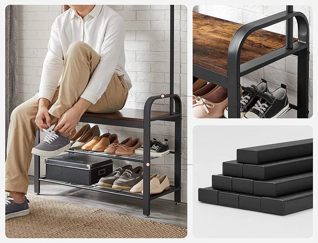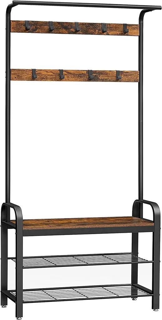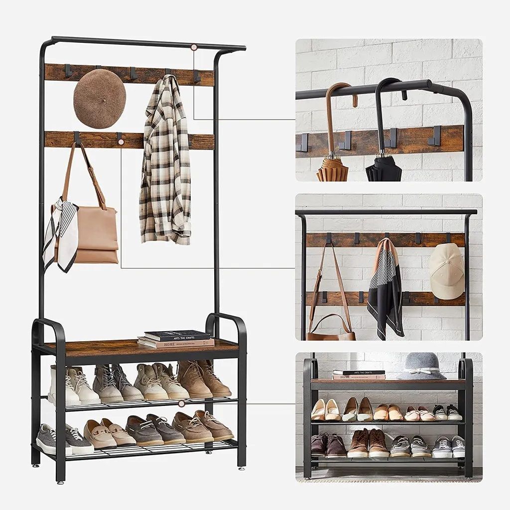 Место для обуви: этот гардеробный стенд предоставляет не только девять прочных крючков и вешалку для одежды в верхней части. Кроме того, он имеет две полки для обуви, на которых удобно надевать их.